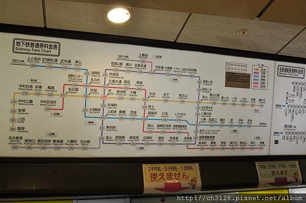 所以只能用文字描述囉2012年拍攝的名古屋地鐵圖(含榮町車站出發的車資表,可點圖稍會比較清楚一點)