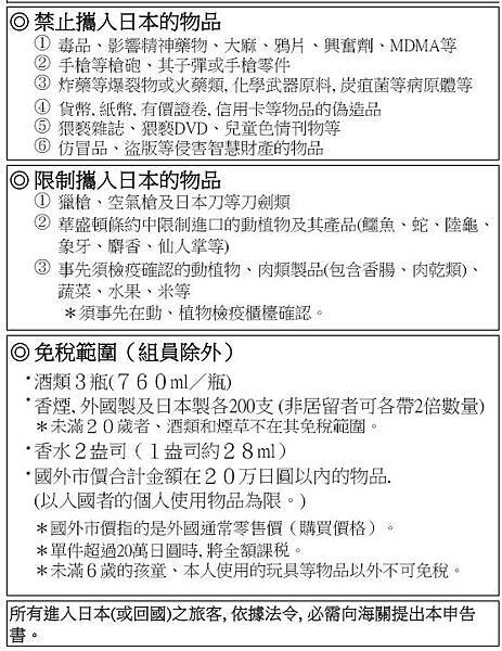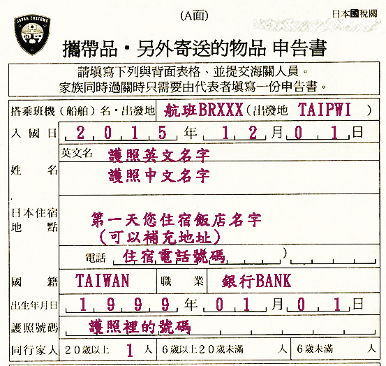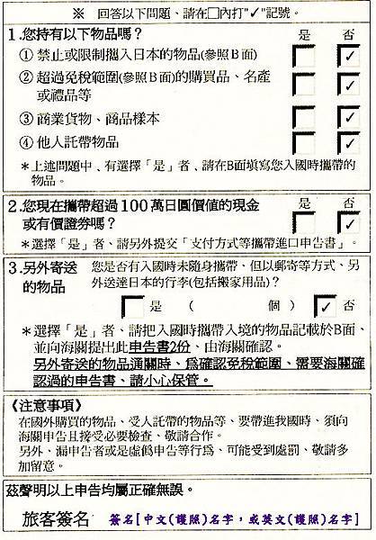 不管您到日本商辦出差、自由行或跟團,都要填寫日本出入境表及申告書,如果您跟旅行社的旅遊團,好心的旅行社會幫您填寫一部份,如果自由行的朋友,記得要與空姐領取哦!!先寫好的話,入境可以省很多時間,不會寫字的小朋友與小寶寶的部分,家長可以代簽,....重點提示,以下介紹的欄位都要填寫哦!!可別都不寫,不然日本移民官會請您到後場補填再重新排隊到日本數次,看過太多重新排隊的事件了