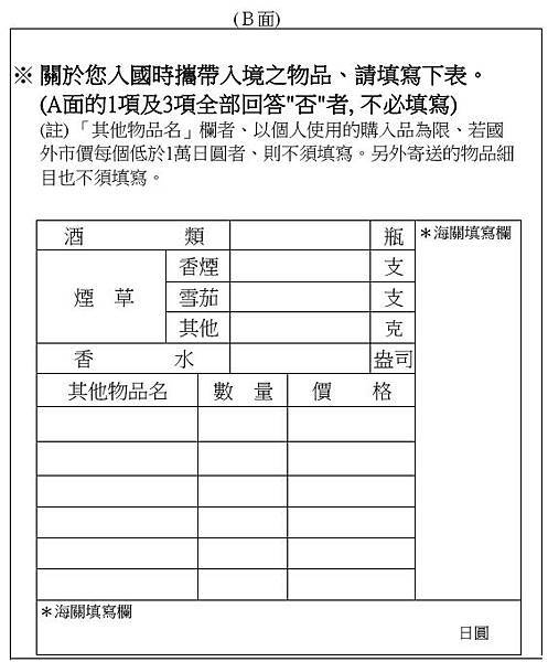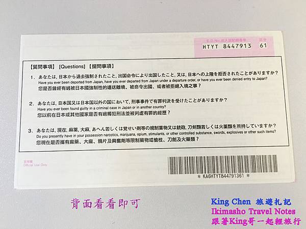 (新版外國人入國記錄卡反面,內容就看看就好了,頂多會被問有沒有帶危禁物品)