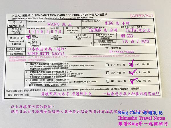 (新版外國人入國記錄卡正面,記得要填寫完整,欄位不能留空白)