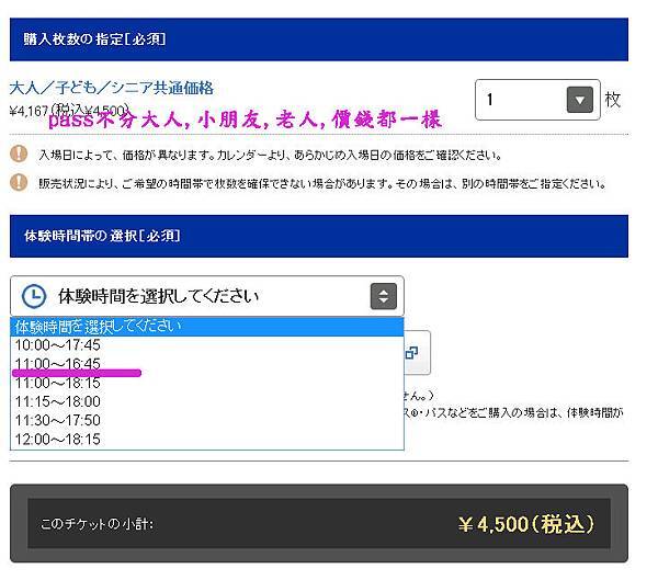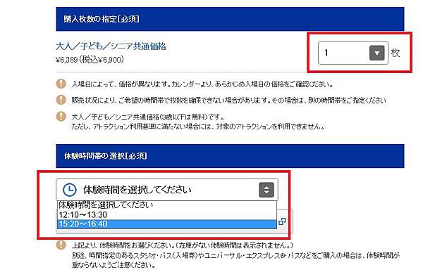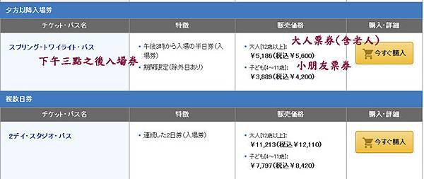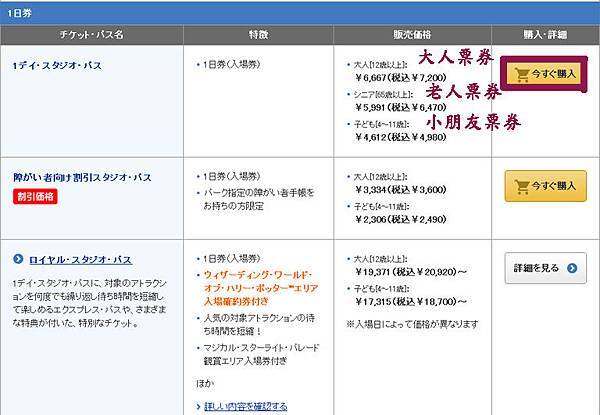 購票的方案很多...一日券..二日券,...一般人都買一日券為例,(成人為[12歲以上],兒童為[411歲],長者為[65歲以上]),注意事項:網路購買二日券者,只能選パーク引き換え(拿購買證明現場換票)本篇範例為購買一日券的方法