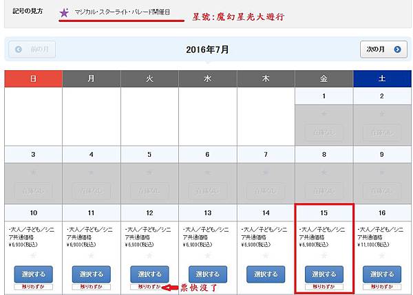 (綠色星星標誌是指:有魔幻星光大遊行的活動)